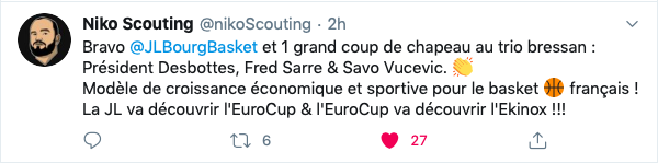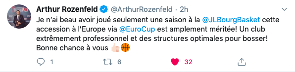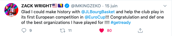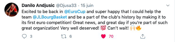 Ravi d’être de retour en @EuroCup et très heureux d’avoir pu aider l’équipe de la @JLBourgBasket et faire partie de l’histoire du club pour sa première compétition européenne ! Excellente nouvelle et excellente journée quand vous faites partie d’une organisation aussi formidable ! Vraiment mérité ! J’ai hâte !